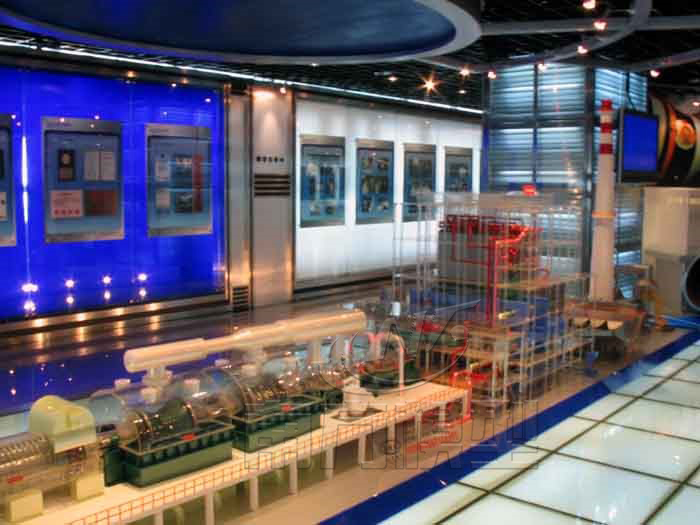 300MW火力發(fā)電廠模型主要系統(tǒng)設(shè)備由燃煤運(yùn)輸系統(tǒng)、鍋爐系統(tǒng)、煙氣處理系統(tǒng)、汽輪機(jī)系統(tǒng)、發(fā)電機(jī)系統(tǒng)與電氣系統(tǒng)等組成,按300MW熱電廠運(yùn)行的300MW火力發(fā)電機(jī)組圖紙縮比制作,300MW燃煤電廠模型包括:鍋爐、汽機(jī)、制粉、除塵、脫硫、脫銷、煙囪、升壓站等幾大部分。將電廠的汽、水、風(fēng)、粉、電幾大系統(tǒng)的設(shè)備,管道以及設(shè)施等按照實(shí)際場(chǎng)景寫實(shí)制作。各系統(tǒng)不同的設(shè)備、管道等分別用實(shí)物配色展示,主要設(shè)備間用燈光顯示,工質(zhì)流動(dòng)方向用箭頭指示。各系統(tǒng)的管道用不同顏色的PMMA材質(zhì)制作,原理準(zhǔn)確,結(jié)構(gòu)清晰。汽機(jī)機(jī)廠房透明或過半剖視,詳細(xì)展示系統(tǒng)運(yùn)行狀態(tài)與模擬汽機(jī)運(yùn)行。輸煤系統(tǒng)部分由輸煤火車、斗輪機(jī)、翻車機(jī)從煤倉(cāng)斜向上皮帶運(yùn)輸機(jī)將翻車機(jī)、 斗輪機(jī)的煤運(yùn)送到下一工段,輸煤皮帶將煤運(yùn)送到各個(gè)煤粉倉(cāng)后進(jìn)入磨煤機(jī)。